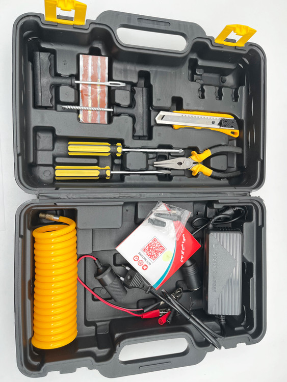 کاتر ، دو عدد پیچگوشتی ، دمباریک، چسب و دو عدد ابزار پنچرگیری ، شلنگ فنری و اداپتور